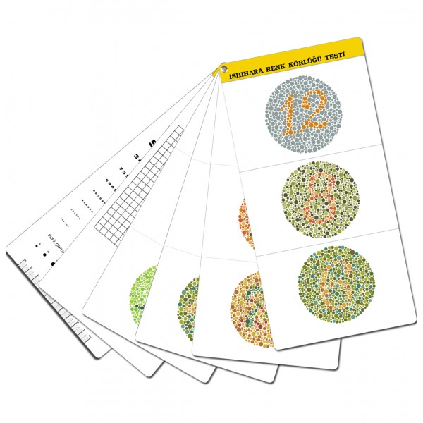 • ISHIHARA RENK KÖRLÜĞÜ TESTİ :24 ayrı renk testi sunulmuştur. Tüm test görselleri dijital ve üstün renk kalitesinde basılmıştır. Renk körlüğünün teşhis edilmesinde kullanılan Ishihara testleri bir arada ve çok pratik şekilde sunulmuştur. Kartlar birbirinden ayrılmaz ve kaybolmaz ayrıca ıslanma ve solma gibi faktörlerden etkilenmez. Her hekimin kolay taşıyacağı formatta sunulmuştur.
